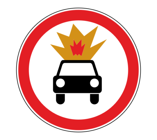 Знак применяют для запрещения движения транспортных средств, осуществляющих перевозку взрывчатых веществ и изделий, а также других грузов, подлежащих маркировке как легковоспламеняющиеся, в количествах, на которые распространяются специальные правила.